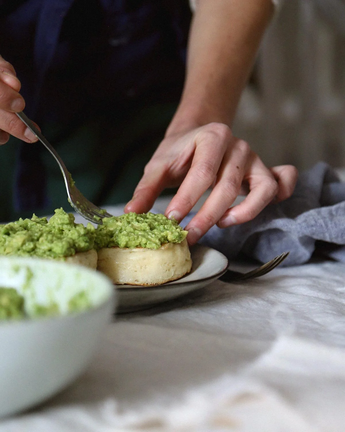Écrasez un avocat bien mûr sur deux crumpets tièdes et y ajouter un peu de zaatar