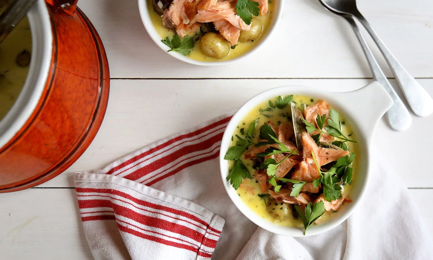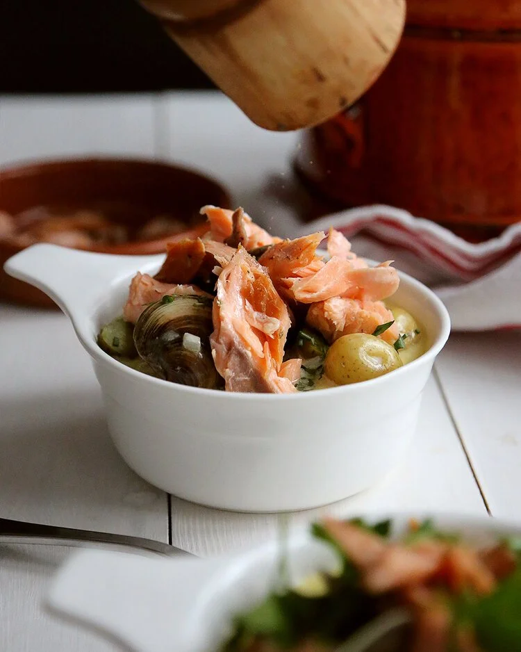 Servir dans des bols, garnir de fines herbes fraîches, de cornichons et de saumon fumé de Fumoirs Gosselin.