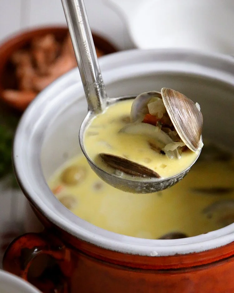 Juste avant de servir, mettre les palourdes à nouveau dans la casserole. Saler et poivrer.