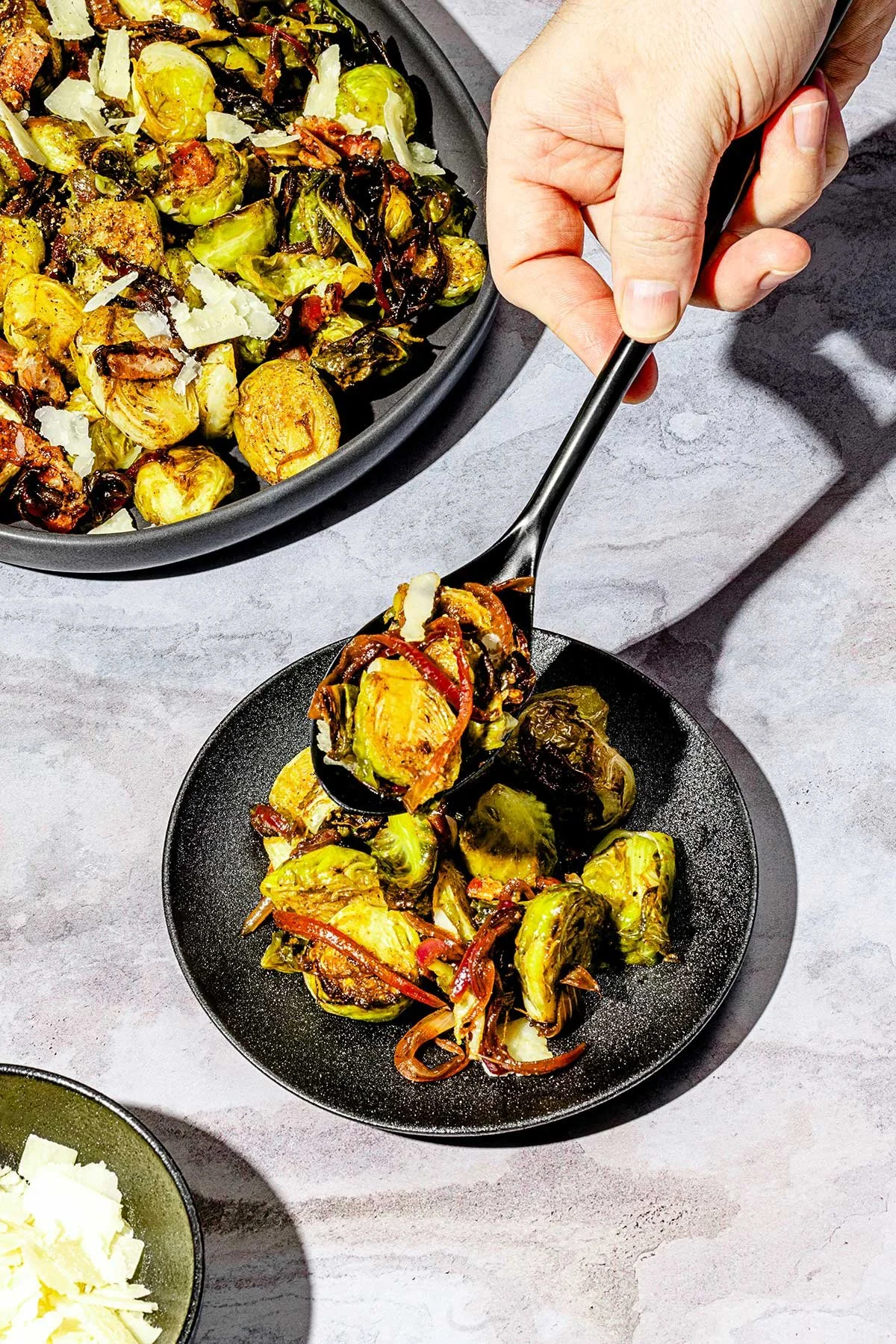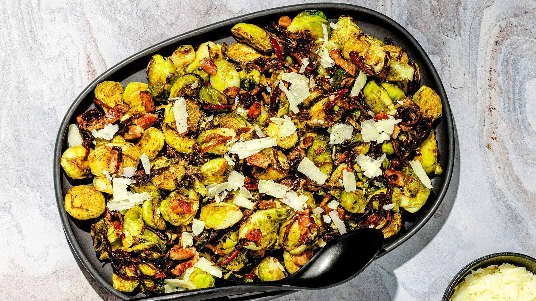 Finalement, dans un grand bol, mélanger les choux de Bruxelles rôtis avec les morceaux de bacon réservés et les oignons confits. Répartir le tout dans une assiette de présentation et garnir de copeaux de parmesan frais.