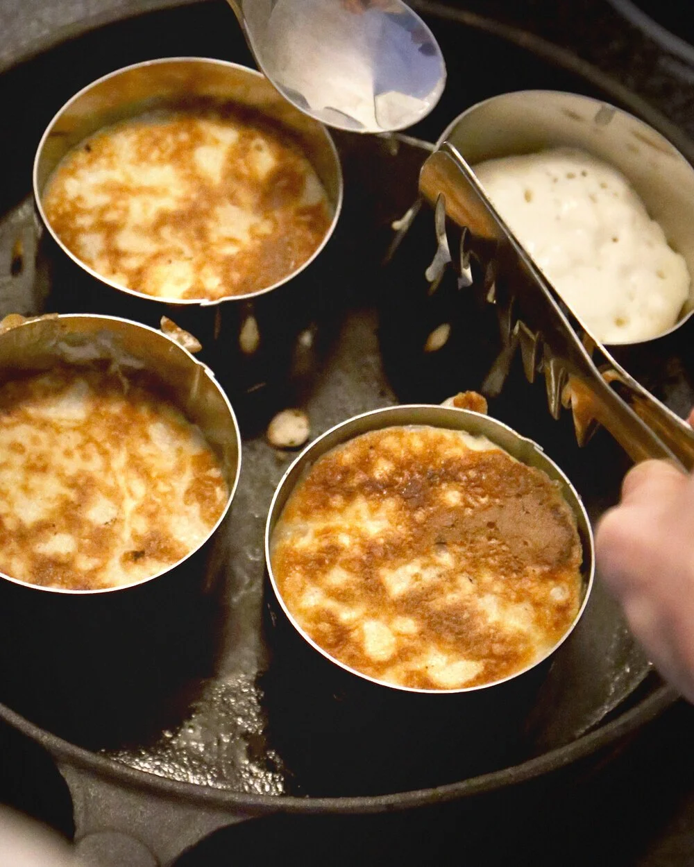 Il suffit de cuire les crumpets jusqu’à ce que des trous se forment dans le haut de votre crumpet. Soit environ 7-8 minutes. Retirez l’anneau et avec une paire de pinces retournez le crumpet.