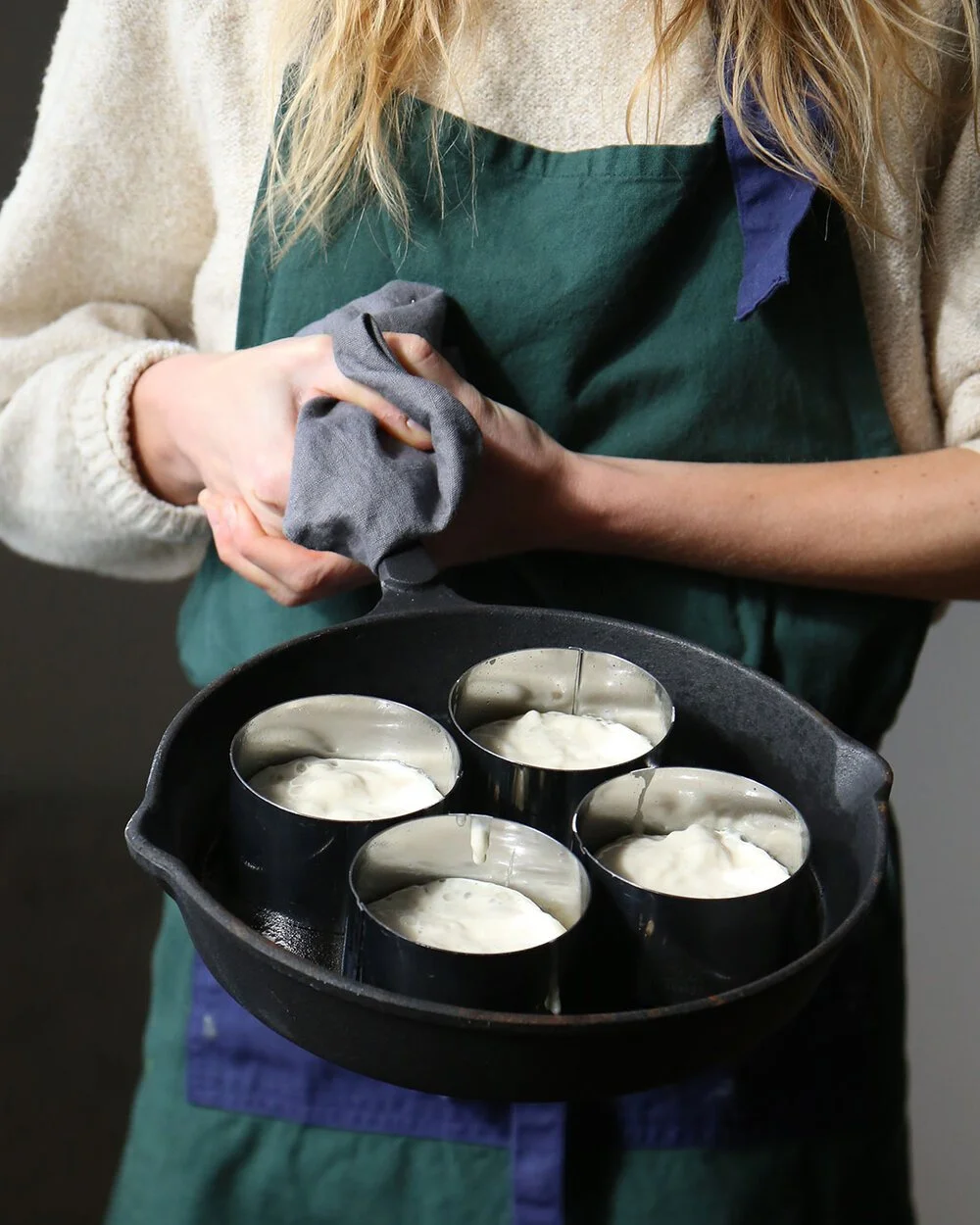 Chauffez une poêle en fonte à feu moyen pendant une minute ou deux, puis baissez le feu à moyen-doux. Mettez un peu d’huile sur la poêle et placez plusieurs anneaux.